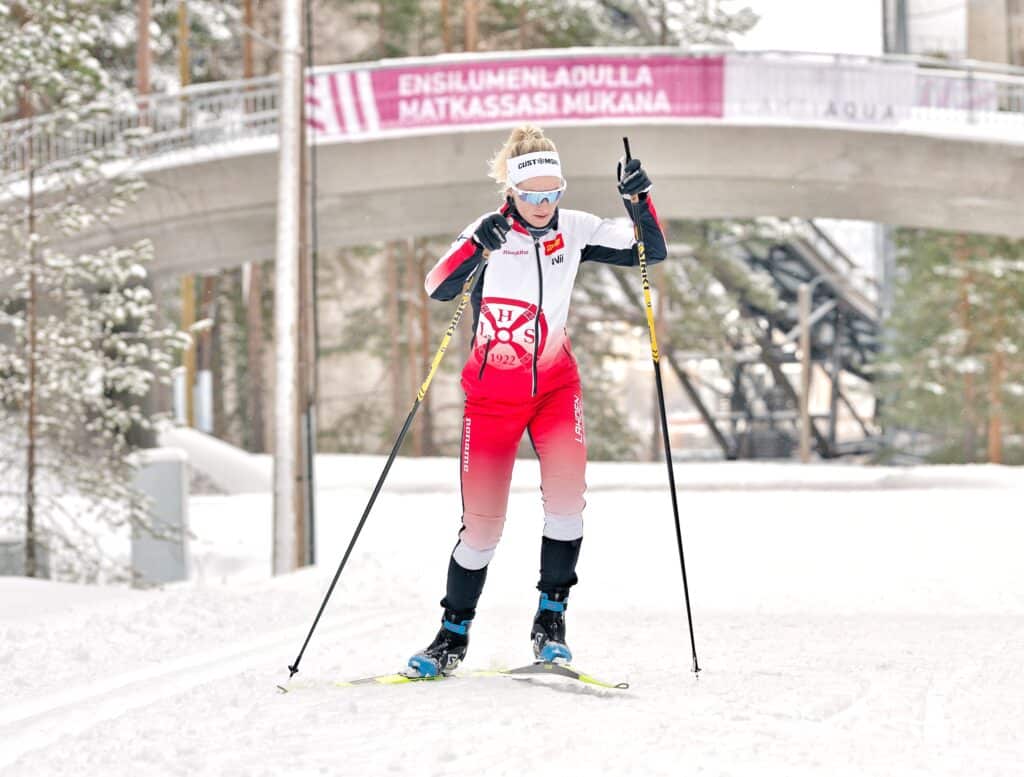 Kuokassa hiihtoasennon tulee olla aina hyökkäävä, jotta saat otettua pidemmän askeleen ja säilytettyä painopisteen edessä. Painopisteen ylittäessä suksen korkeimman kohdan suksi lähtee kuin itsestään liukuun. Pidä pakara- ja keskivartalopito koko ajan aktiivisena, jotta saat säilytettyä hyökkäävän asennon myös työnnön lopussa.
