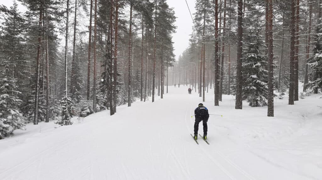 Ladun kaartaessa käännöksissä voidaan laskea latua pitkin, jolloin tulee nojata voimakkaasti vartalolla sisäänpäin. Tällöin paine on ulommaisella suksella, jolla taistellaan ”keskipakoisvoimaa” vasten. Mitä kovemmaksi vauhti tulee, sen enemmän käännytään sisäkurvin puoleen ja tehdään ulkojalalla työtä.